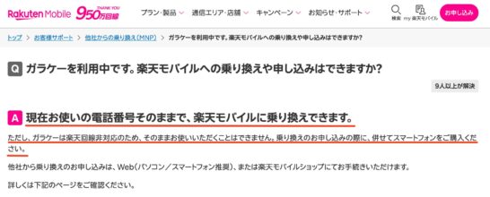 楽天モバイルの公式サイトにある「ガラケーは楽天回線非対応のため、そのまま使えません」